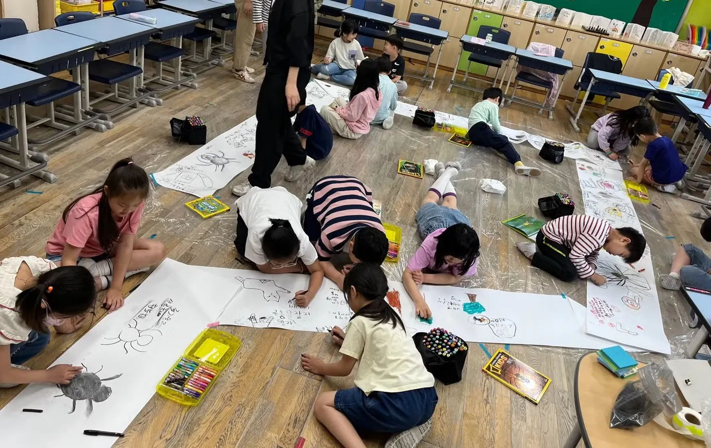 길고 긴 도화지를 준비했다. 우리 모두의 상상과 이야기를 담으려면 직사각형의 평범한 도화지로는 부족하다. 롤 도화지를 준비하고 교실 바닥에 길게길게 펼쳐놓았다. 붓펜, 색연필, 파스텔, 콜라쥬, 물감 스프레이, 스티커, 목탄 등 다양한 그리기 도구들을 도화지 사이사이에 펼쳐놓은 후 학생들이 모두 나와 표현할 수 있도록 하였다. 앞서 그린 그림과 내 그림을 연결하니 이야기가 이어지고 이어지면서 풍성해졌다. 그리고 친구가 그리는 과정을 보면서 새로운 아이디어를 떠올려 그리기도 하였으며, 함께 이야기를 상상하면서 또 다른 아이디어가 떠오르기도 하였다. 이렇게 학교생활 안내서는 길게 길게 이어졌다. 학생들은 자유롭게 이곳저곳을 옮겨다니면서 그림을 그렸고, 점점 길어지는 그림과 이야기에 몰입하며 새로운 상상과 이야기를 연결해갔다. 손과 옷에 묻는 얼룩은 개의치 않게 되었고 학생들의 동작은 더욱 과감해지면서 작품은 점점 커져만 갔다.