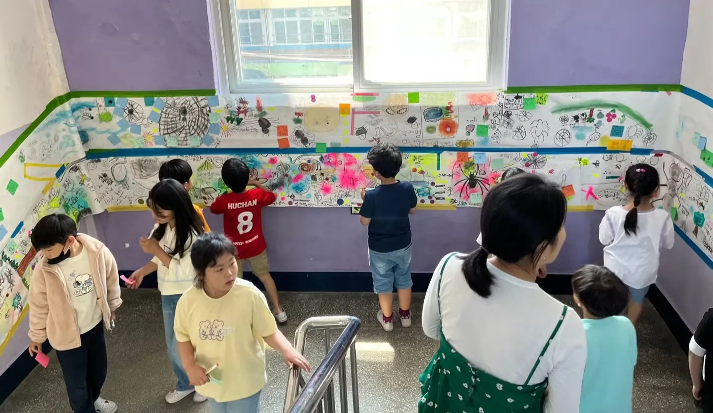 그런데 이 길고 긴 작품을 어디에 전시하지? 교사와 예술가들은 고민하기 시작했다. 사실 건물 밖 공간에 전시하고 싶었으나 바람이나 비로 인해 훼손될 수 있었다. 고심끝에 계단 복도벽을 전시장소로 선정하고 1층부터 오르면서 볼 수 있도록 작품을 설치하였다. 여러 학년의 학생들이 오르내리면서 감상하고, 감상자들도 적극적으로 이야기를 더할 수 있도록 허용하였다. 작품 감상은 적극적으로 사고하는 과정이기에 교사와 예술가들은 학생들이 생각과 의견을 나눌 수 있도록 질문을 하였다. 작품의 제목은 무엇인지, 다른 반 작품과 우리 반 작품이 어떻게 다른지 또는 같은지, 작품을 제작하며 인상 깊었던 점, 친구의 표현에서 소개하고 싶거나 인상적인 점 등을 이야기하였다.