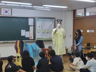 연천지역에 있는 재인폭포 이야기를 조금 각색하여 아이들과 함께 연극언어로 탐구하는 시간을 가졌다. 내가 '아차차'교관(역할 내 교사(Teacher-in-role))으로 등장하며, 아이들에게 재인폭포에 대한 이야기를 시작하고, 그 후 아이들에게 “무너지는 학교를 도와줘!”라고
