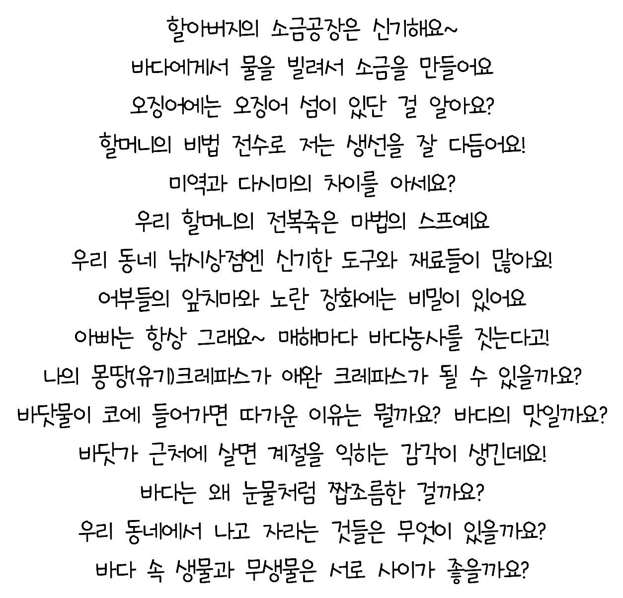 학생들은 마을에서 자라며 겪은, 알게 된 많은 이야기를 해주었습니다. 학교에서는 투정만 부리던 아이가 할머니와 엄마를 도와 오징어와 생선을 다듬는 비법 전수자라는 사실, 수업에 관심 없던 아이가 동네 삼촌들의 옷차림 속에서 바다 생활의 과학을 이야기하는가 하면, 관찰력이 없던 아이가 다시마와 미역의 차이와 상관관계를 분석적으로 이야기를 하고 항상 창밖의 먼 산이 아닌 먼 바다를 바라보는 아이에게서 배의 모습과 형태에 따른 기능을 선생님과 예술가가 아이를 통해 배워가기 시작했습니다.