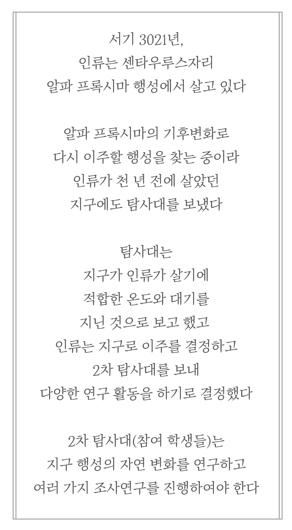 자문 과정에서 참여자가 활동에 몰입할 수 있도록 스토리텔링의 요소를 추가해야 한다는 뜻밖의 조언을 듣게 되었습니다. 조언을 수용하여 스토리텔링을 도입하여 배경 스토리를 만들고 보니, 각각의 회차별 수업이 일관성 있는 하나의 주제로 자연스럽게 연결되며, 배경 스토리를 기초로 한 다양한 아이디어들이 자연스럽게 도출되는 등 긍정적인 효과가 컸습니다.